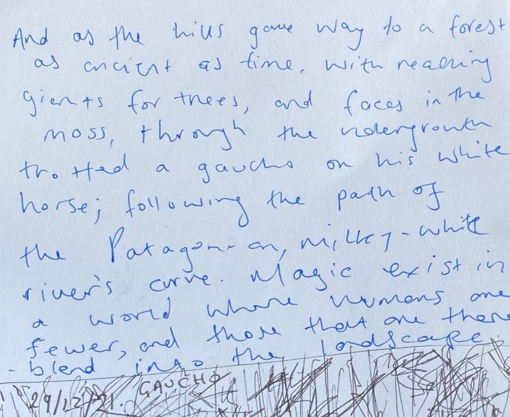 As the steep hills gave way to a forest as ancient as time, with reaching giants for trees, and faces in the moss, through the emerald undergrowth trotted a gaucho on his white horse; following the path of the Patagonian, milky-white river’s curve.
