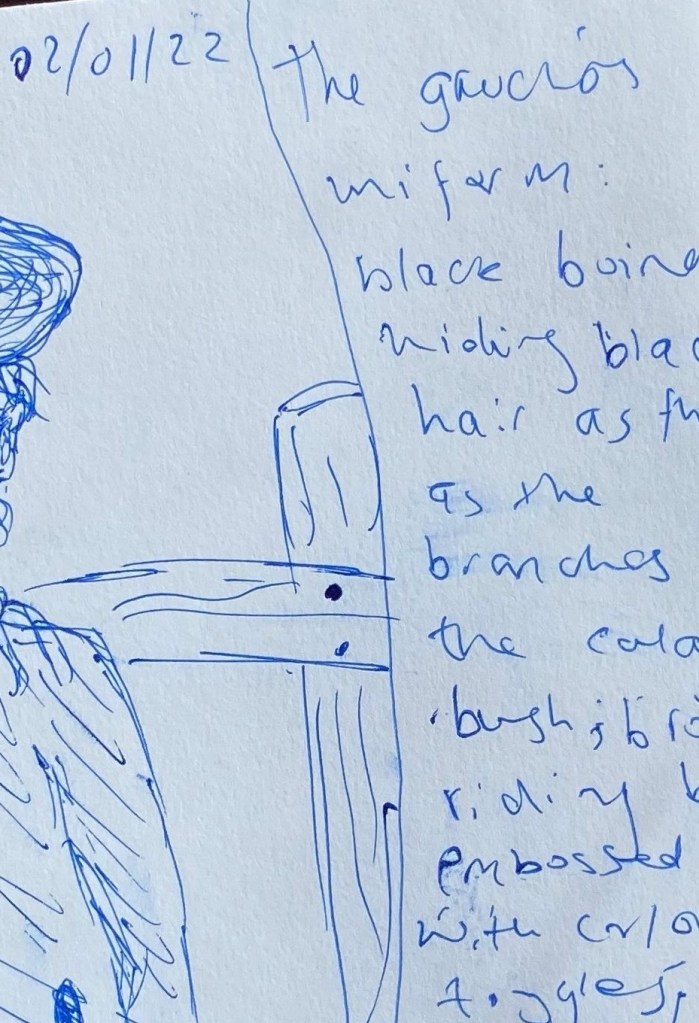 Black boina hiding black hair as thick as the branches of the calafaté bush; brown leather riding boots embossed with colorful toggles, and intricate stitching; Pamperos in beige, or grey, buttoned at the bottom; a button-down shirt, topped with a thick wool jumper, topped with a canvas gilet; and a knife holster filled with a horn handle, and sharp blade. Ready for anything.