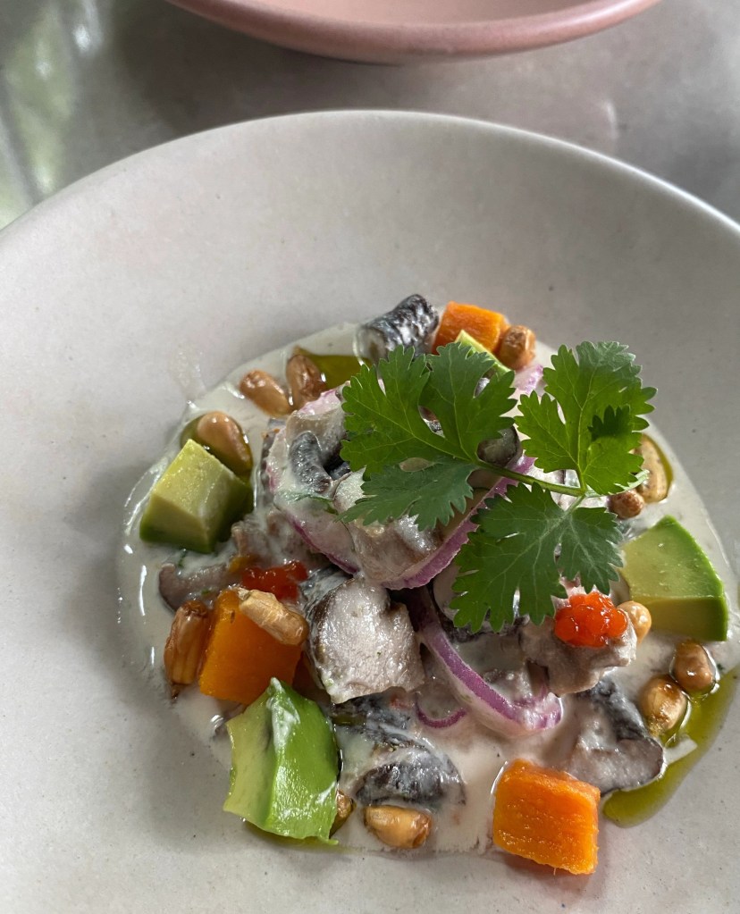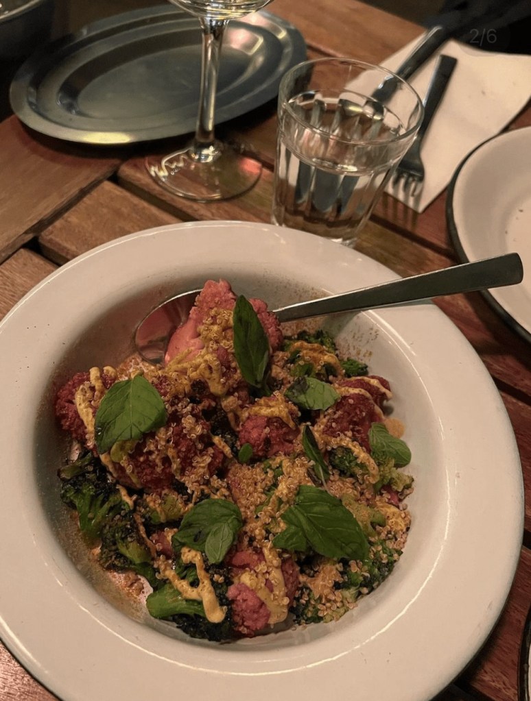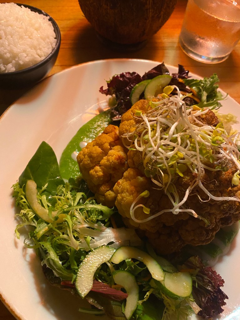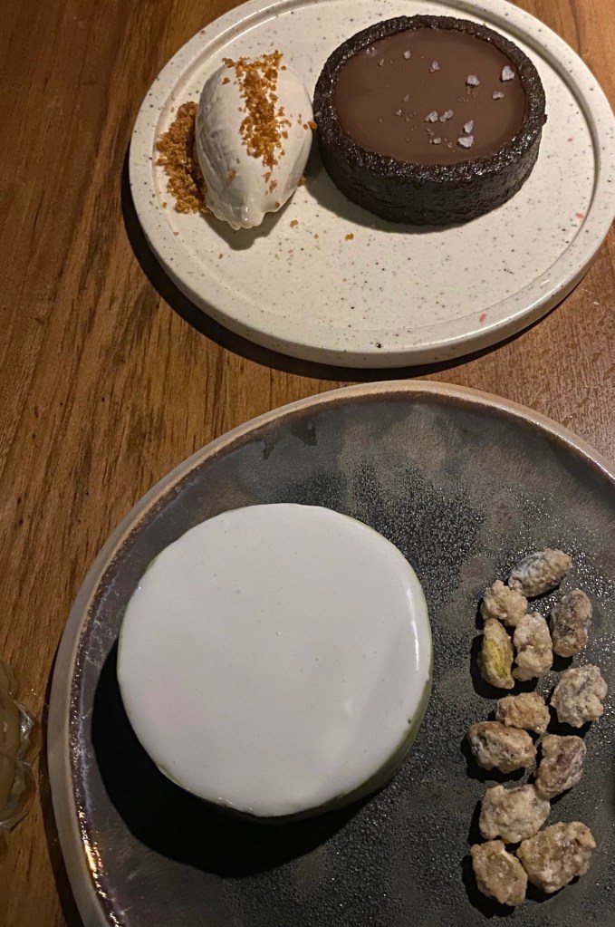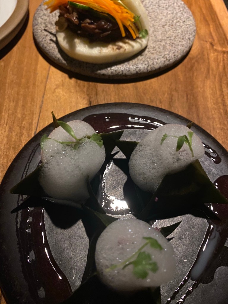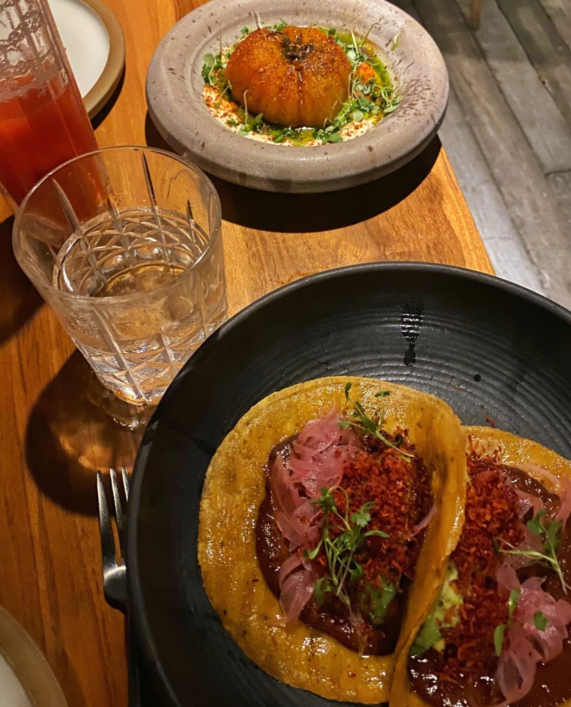 Sacro. I first visited here with my new travel bestie Estelle for my 24th birthday. We had been out in the city all day and wanted somewhere plant-based to go for dinner. We did a classic Google search: “open now,” “vegan,” and Sacro came up. It was close, and so we bee-lined there. To start with we couldn’t find it. It has very subtle branding, and a door that blends perfectly into the wall. Upon entering, it’s like stepping into a rainforest. There are misting machines, bird song, giant ferns, and the room is quite dark. Little did we know prior, that Sacro is fine dining. It’s high-quality, innovative vegan cookery, and it is incredible. The ambiance is relaxing, yet formal, and we were lucky to get seated as it is very popular. It is the type of vegan food that doesn’t feel vegan. Exceptionally clever cooking, paired with seasonality, and big flavour. It is relatively expensive by BA standards, but my gosh is it worth it. Food artistry.